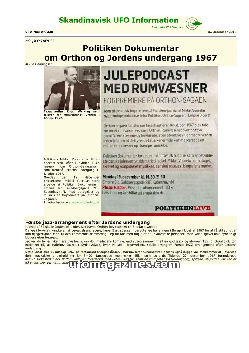 This issue of Skandinavisk UFO Information features a cover story on the Politiken documentary and podcast series about the Orthon movement and their prediction of Earth's end in 1