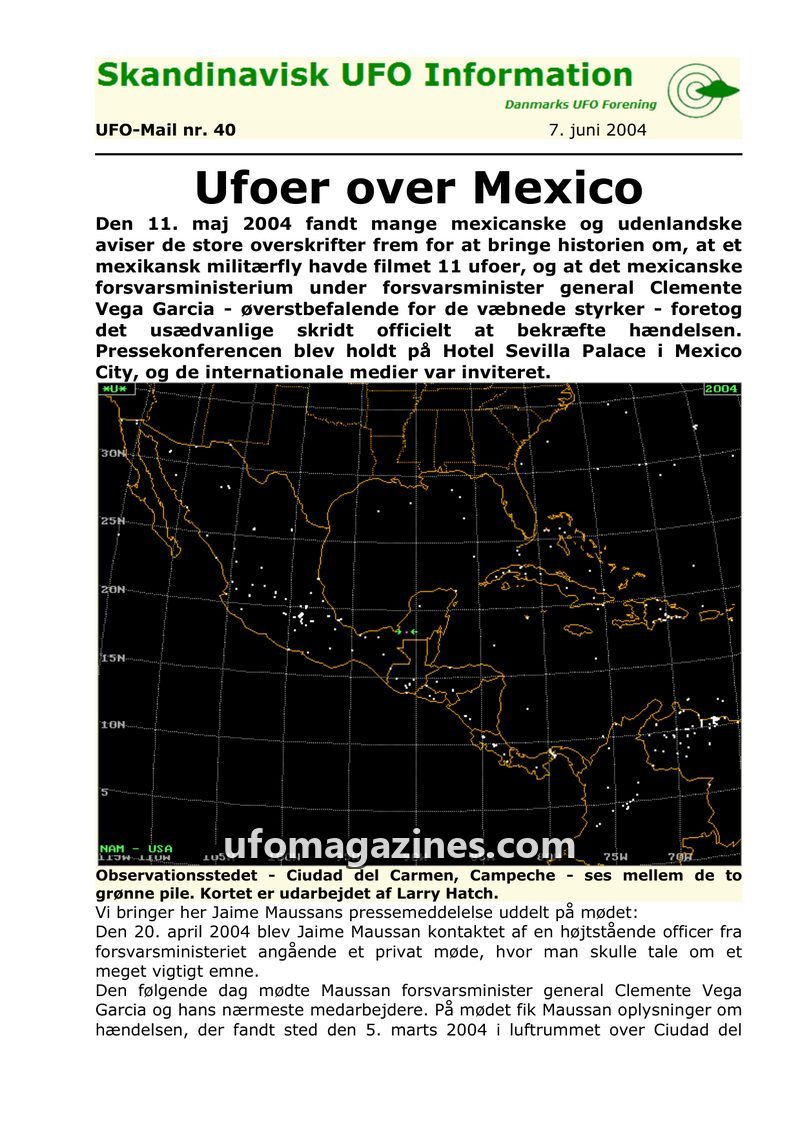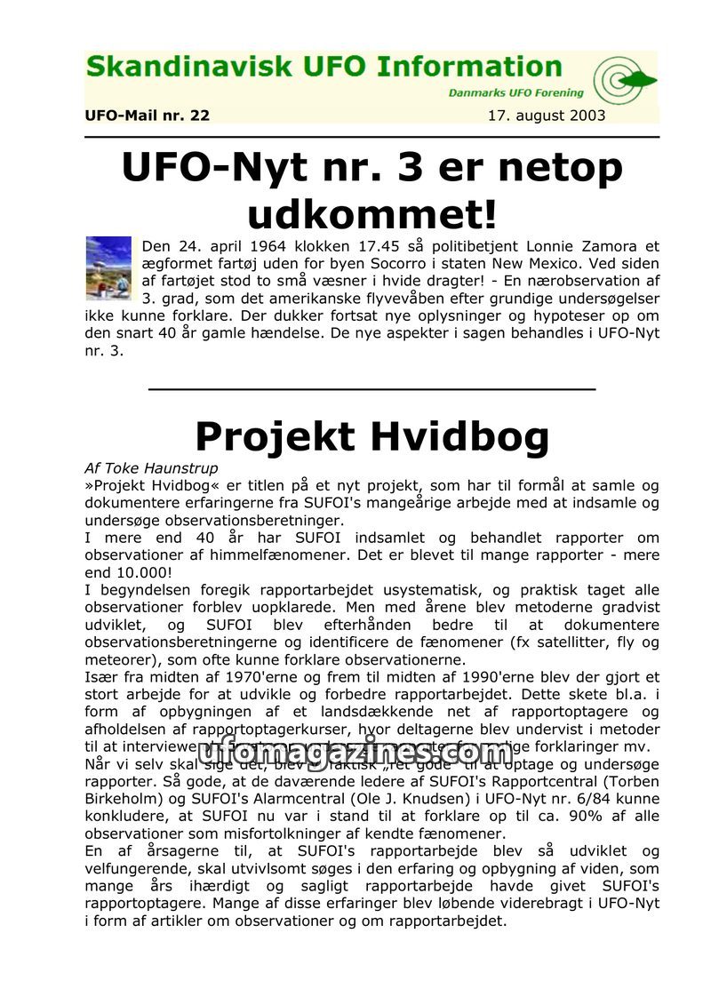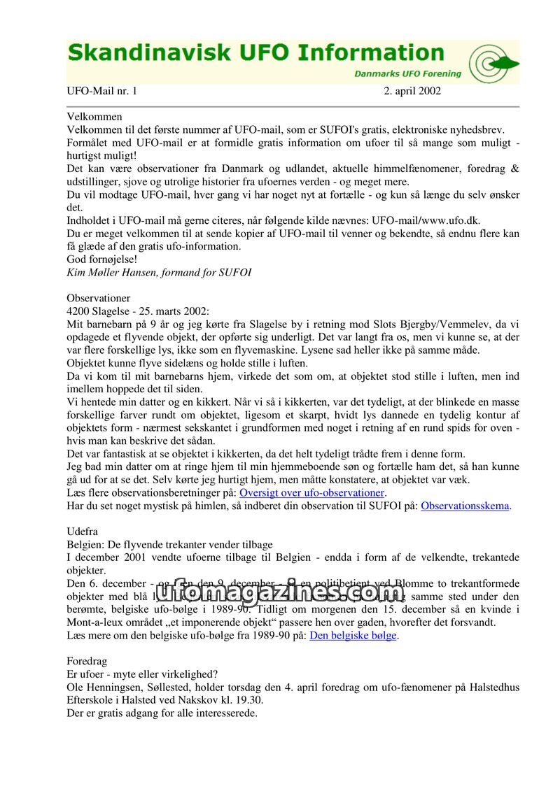 The inaugural issue of UFO-mail, a free electronic newsletter from Danmarks UFO Forening, aims to disseminate UFO information. It features a detailed account of a UFO sighting near