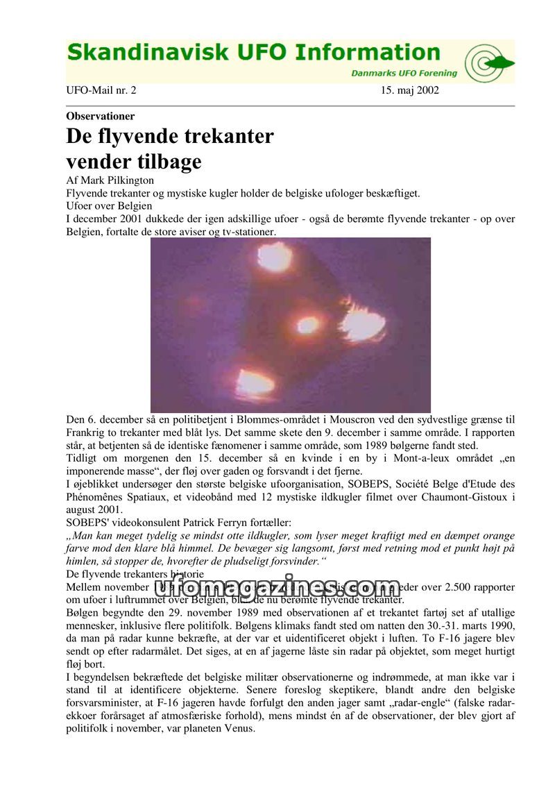 This issue of Skandinavisk UFO Information details the resurgence of flying triangle sightings in Belgium in late 2001, recalling the significant Belgian UFO wave of 1989-1990. It