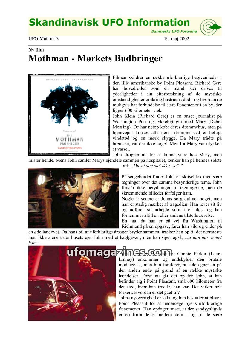 This issue reviews the film 'Mothman - Mørkets Budbringer,' which depicts unexplained events in Point Pleasant, West Virginia. The film stars Richard Gere as a journalist investiga