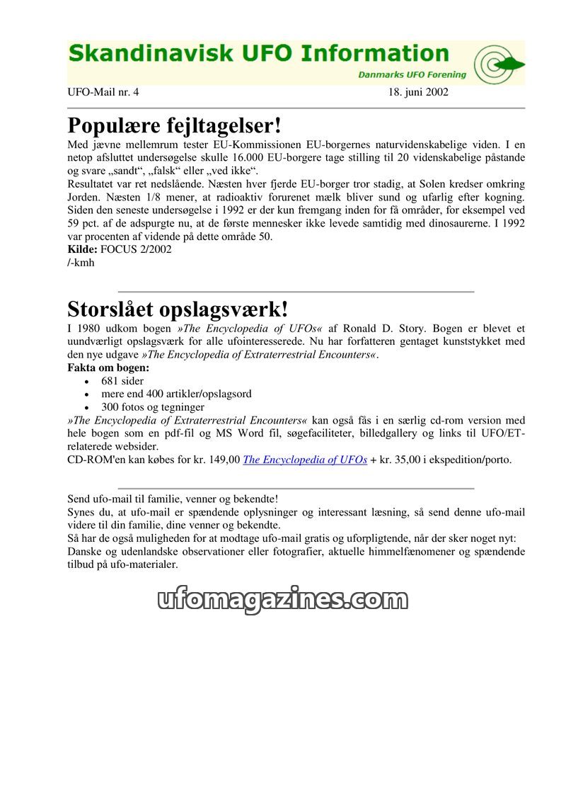 This issue of Skandinavisk UFO Information, dated June 18, 2002, highlights a survey revealing that many EU citizens hold scientifically inaccurate beliefs, such as the Sun orbitin