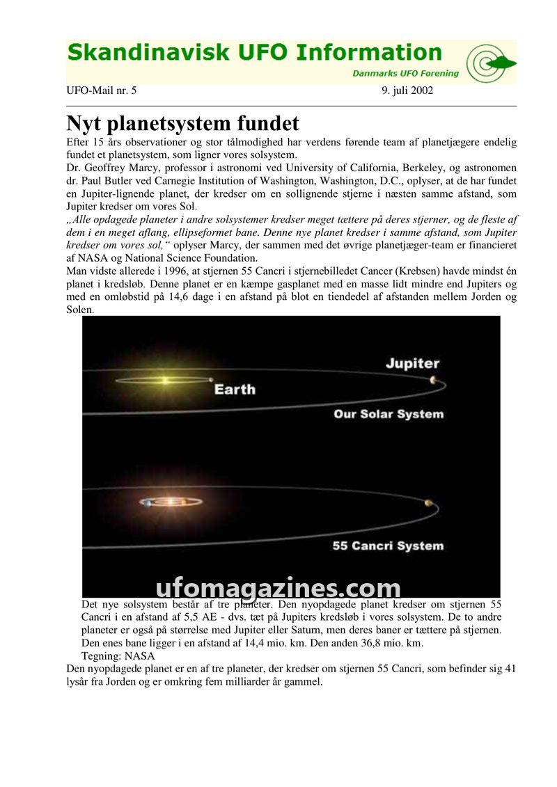 This issue of Skandinavisk UFO Information reports on the discovery of a new planetary system around the star 55 Cancri, which bears similarities to our own solar system. The syste