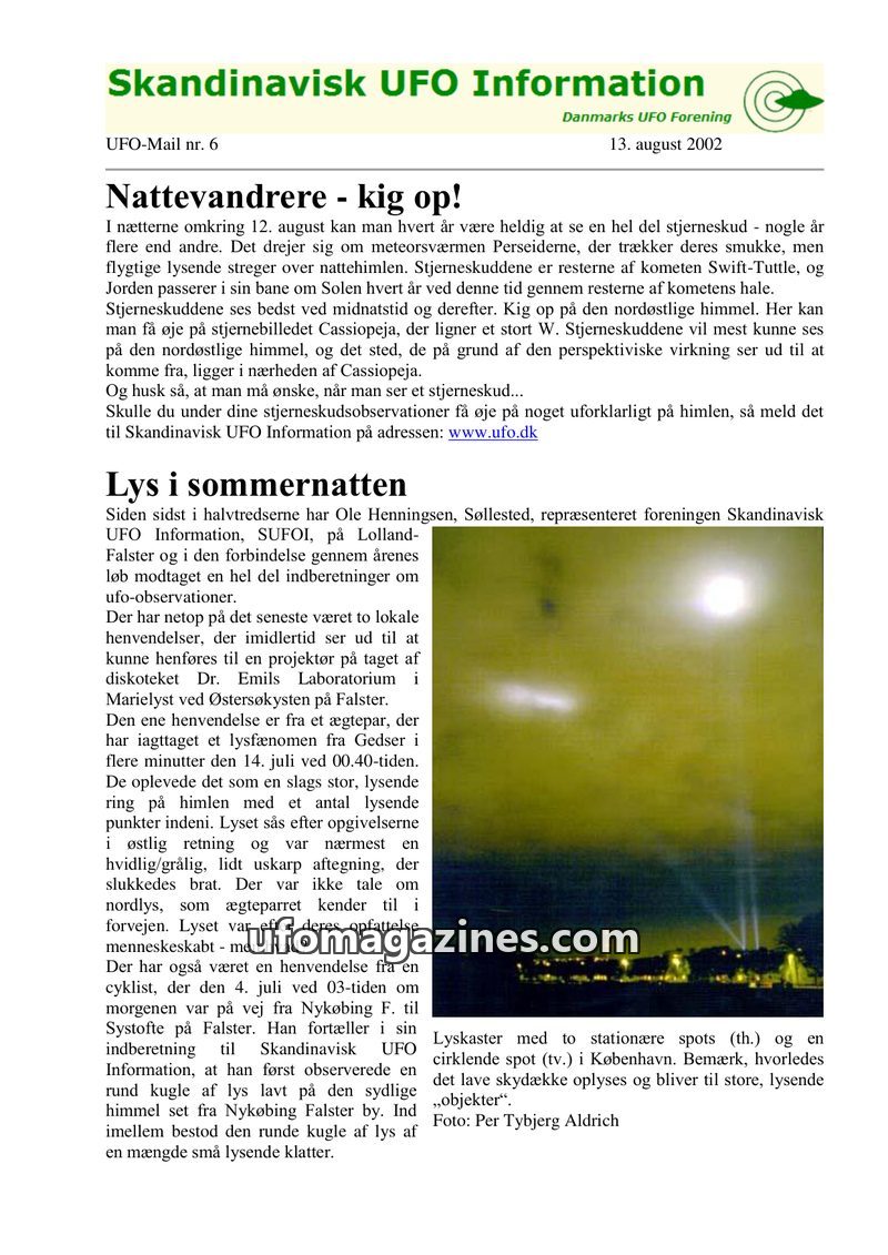 This issue of Skandinavisk UFO Information from August 2002 covers several topics. It discusses the Perseid meteor shower and how to observe it, and debunks recent UFO sightings on