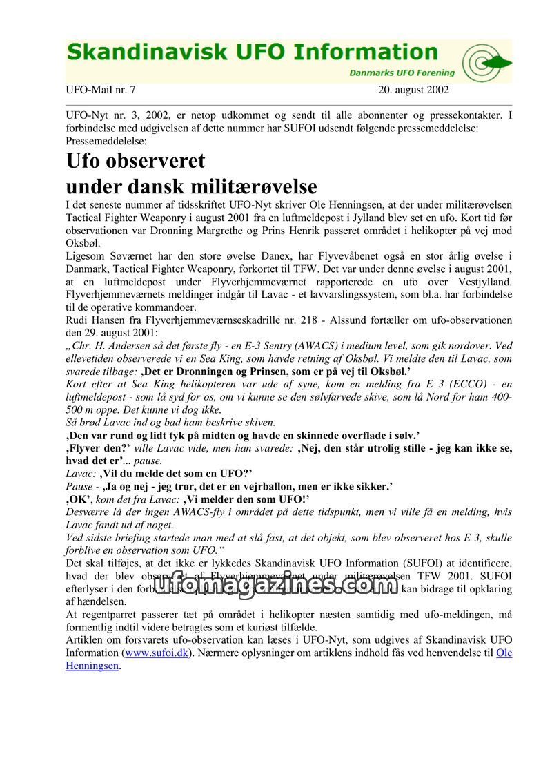 This issue of Skandinavisk UFO Information reports on a UAP sighting during the 2001 Tactical Fighter Weaponry military exercise in Denmark, where a silver disc was observed hoveri
