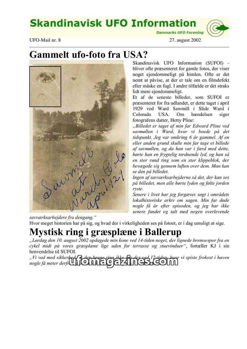 This issue of Skandinavisk UFO Information features a 1929 photograph from Colorado, USA, allegedly showing a large, round aerial object, as described by the photographer's daughte