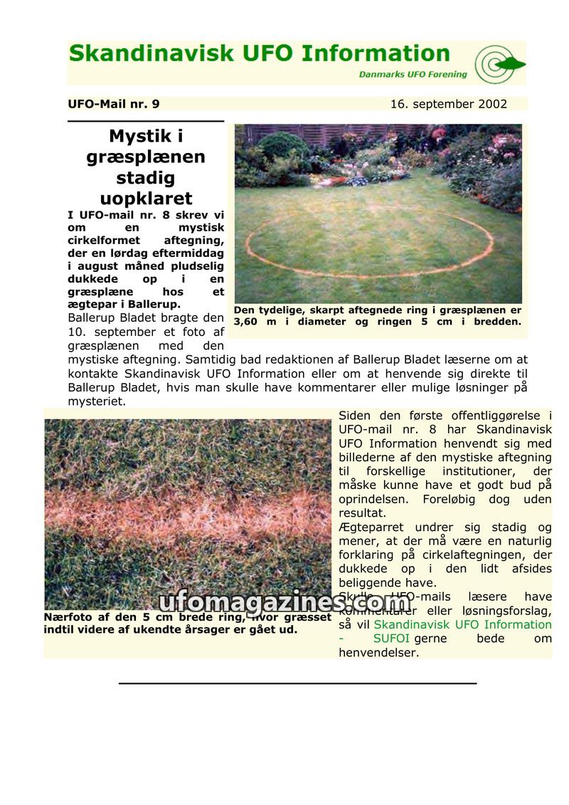 This issue of Skandinavisk UFO Information reports on a mysterious circular formation discovered in a Ballerup lawn, which remains unexplained despite investigations. It also detai