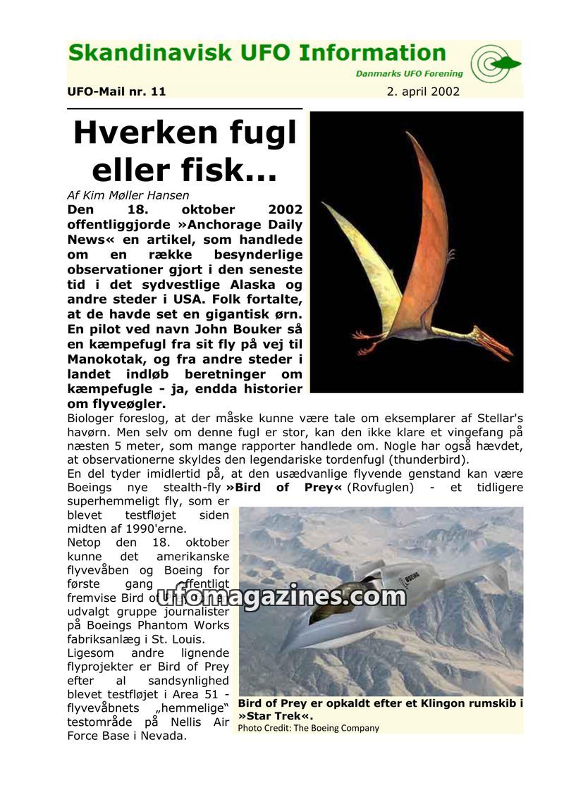 This issue of Skandinavisk UFO Information investigates unusual sightings in Alaska, initially attributed to giant birds or legendary thunderbirds, but potentially explained by Boe