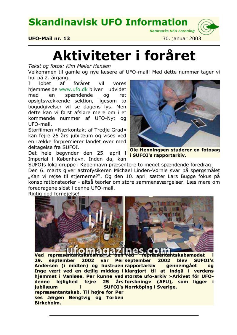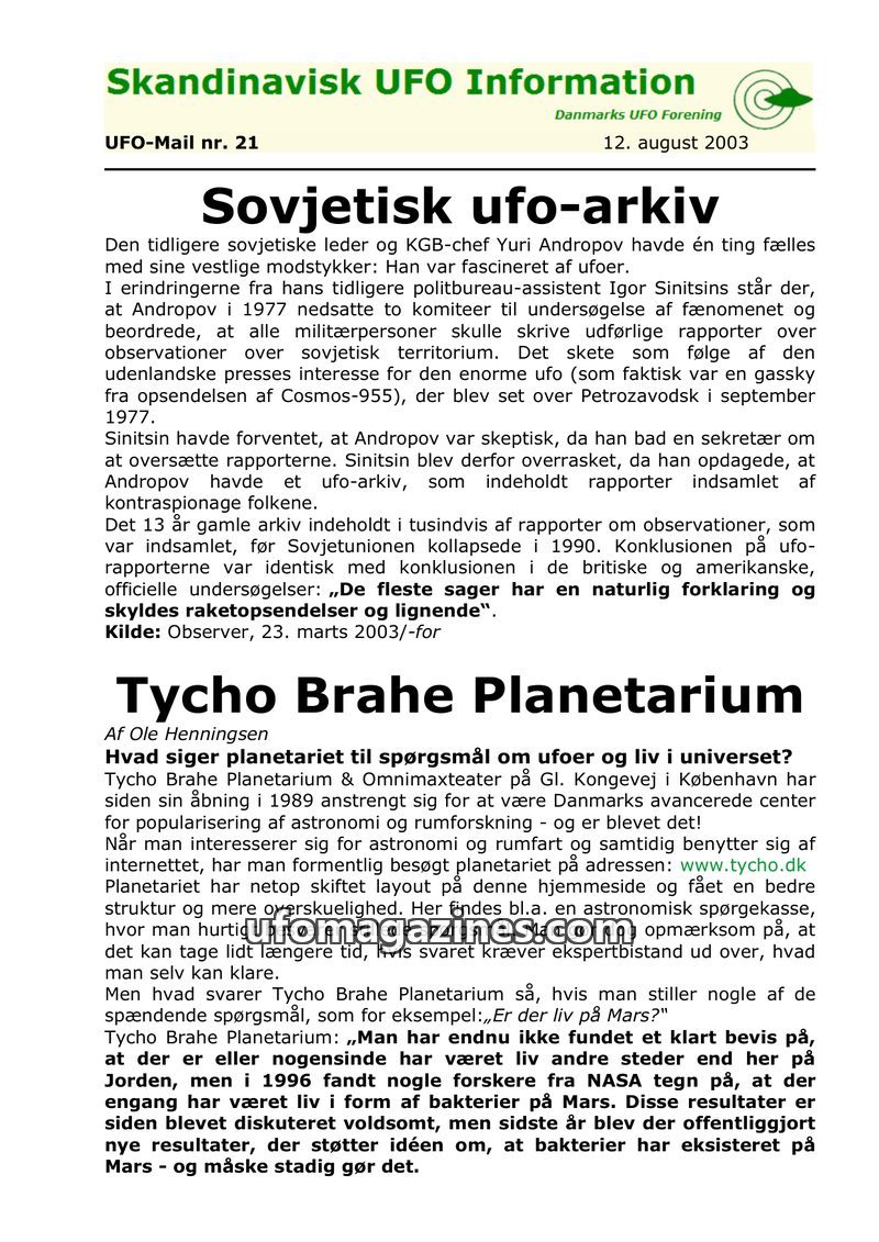 This issue of Skandinavisk UFO Information covers several topics including a potential UFO sighting that was identified as a dust particle illuminated by a camera flash, the testin
