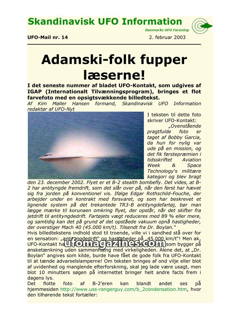 This issue of Skandinavisk UFO Information debunks a sensational claim published in UFO-Kontakt magazine. The claim, based on a photo by Bobby Garcia and attributed to 'Dr. Boylan'