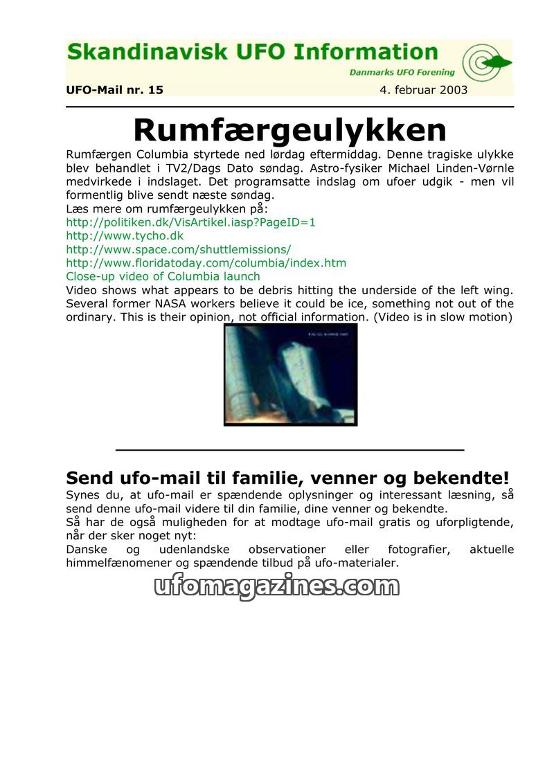 This issue of Skandinavisk UFO Information focuses on the Space Shuttle Columbia disaster, which occurred on a Saturday afternoon. The event was covered by TV2/Dags Dato, featuring
