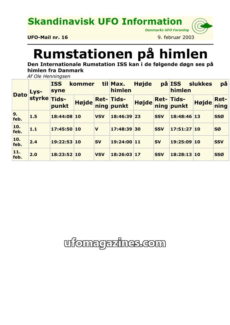 This issue of Skandinavisk UFO Information focuses on the visibility of the International Space Station (ISS) from Denmark in early February 2003, providing specific times and dire