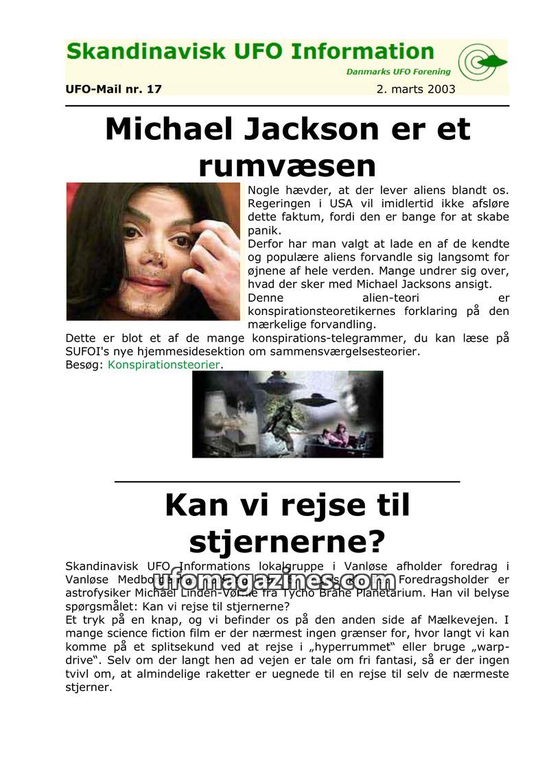 This issue of Skandinavisk UFO Information discusses conspiracy theories, including one suggesting Michael Jackson is an alien. It also covers a lecture on the challenges of space