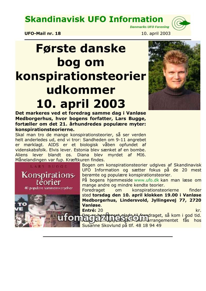 This issue of Skandinavisk UFO Information, dated April 10, 2003, announces the release of the first Danish book on conspiracy theories by Lars Bugge, accompanied by a lecture in V
