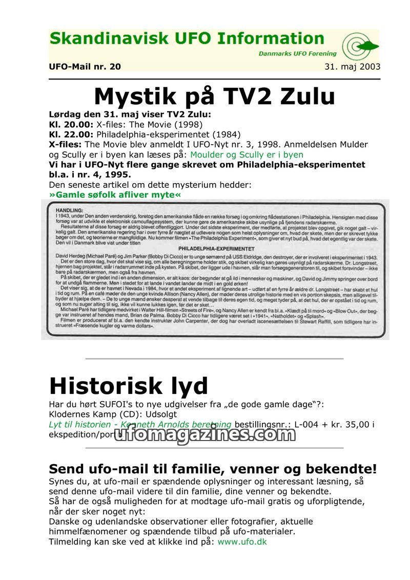 This issue of Skandinavisk UFO Information from May 31, 2003, highlights two TV programs: 'X-files: The Movie' and 'Philadelphia Experiment'. The latter is detailed with a plot sum