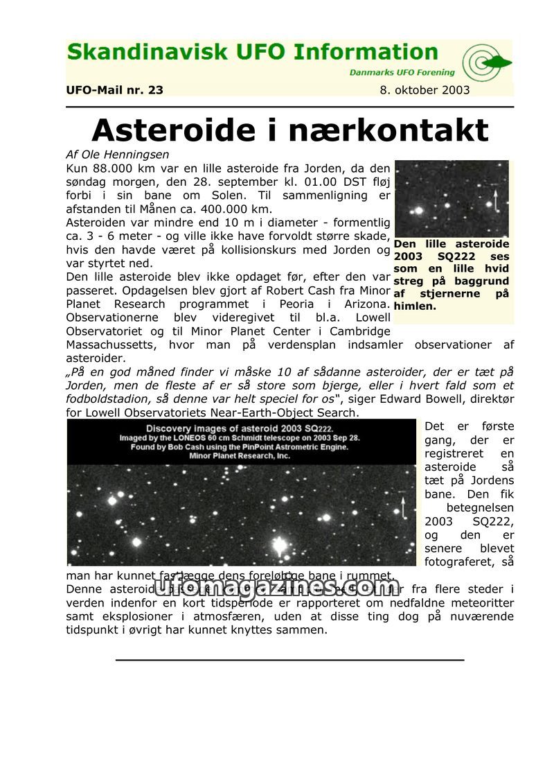 This issue of Skandinavisk UFO Information covers several astronomical and atmospheric events. A small asteroid, 2003 SQ222, passed unusually close to Earth (88,000 km) on Septembe