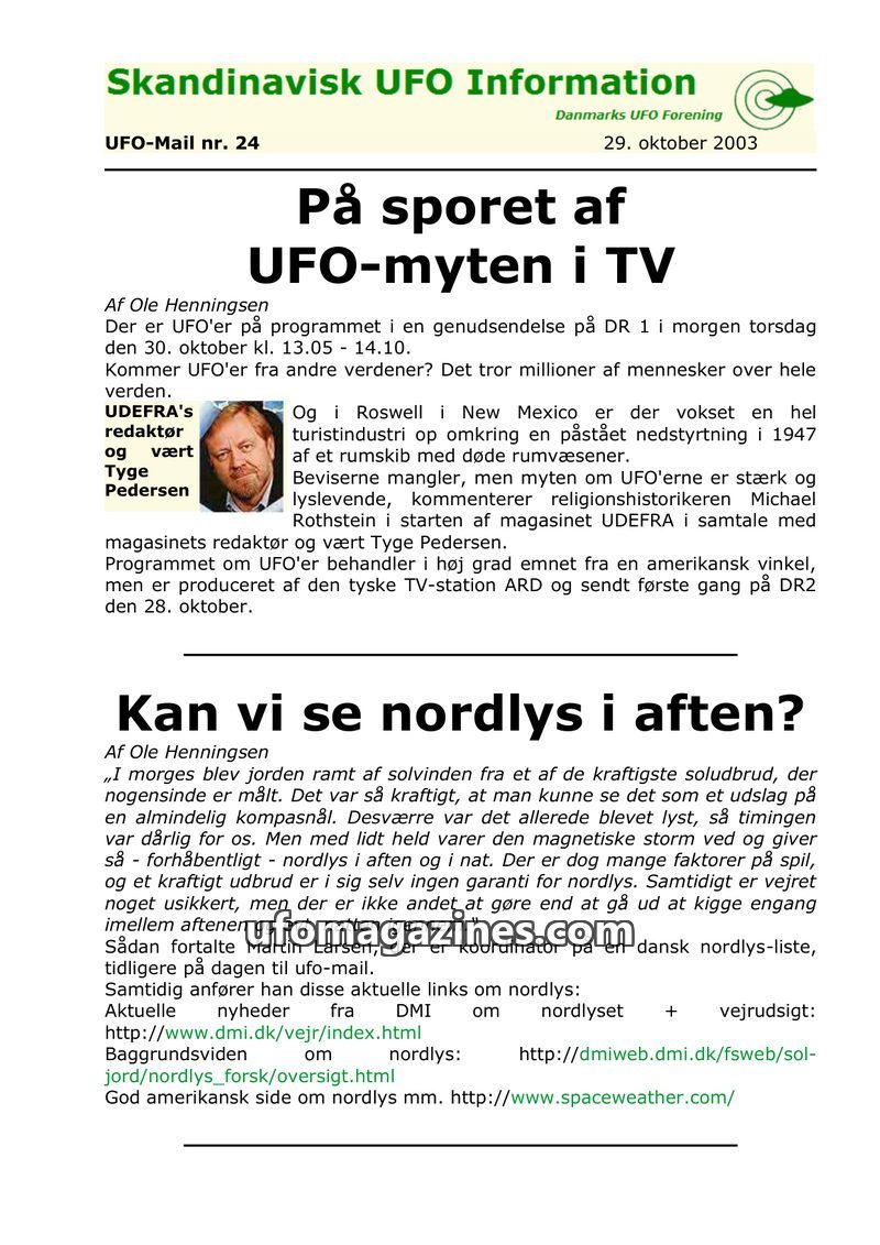 This issue of Skandinavisk UFO Information discusses a TV program on DR1 about the UFO myth, featuring insights from historian Michael Rothstein and an interview with UDEFRA's edit