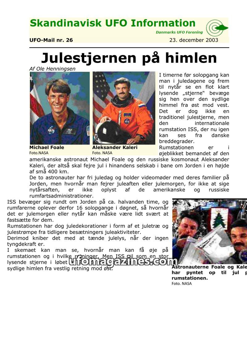 This issue of Skandinavisk UFO Information covers several topics. It highlights the International Space Station (ISS) being visible as a bright 'star' in the night sky during the C