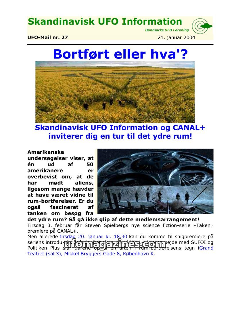 This issue of Skandinavisk UFO Information focuses on alien abductions, highlighting that 1 in 50 Americans believe they have met aliens. It announces a special event in Copenhagen