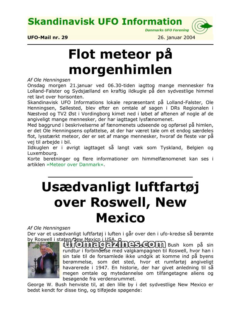 This issue of Skandinavisk UFO Information covers a bright meteor sighting in Denmark and discusses the historical context of UFO phenomena, particularly focusing on alien abductio