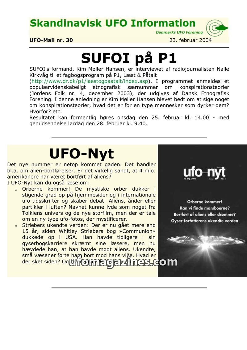This issue of Skandinavisk UFO Information covers several topics. It reports on an interview with SUFOI chairman Kim Møller Hansen on P1 radio discussing conspiracy theories. The '