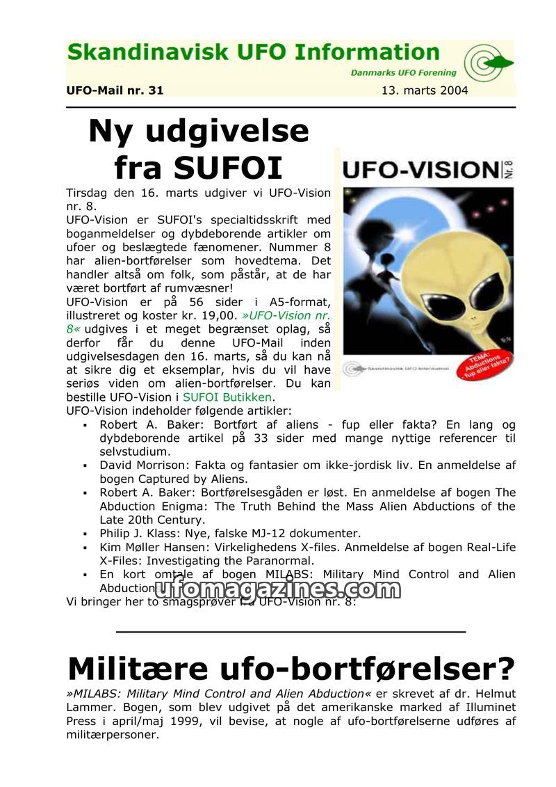 This issue of UFO-Mail announces the release of UFO-Vision nr. 8, which focuses on alien abductions, featuring articles by Robert A. Baker and reviews of books like 'MILABS: Milita