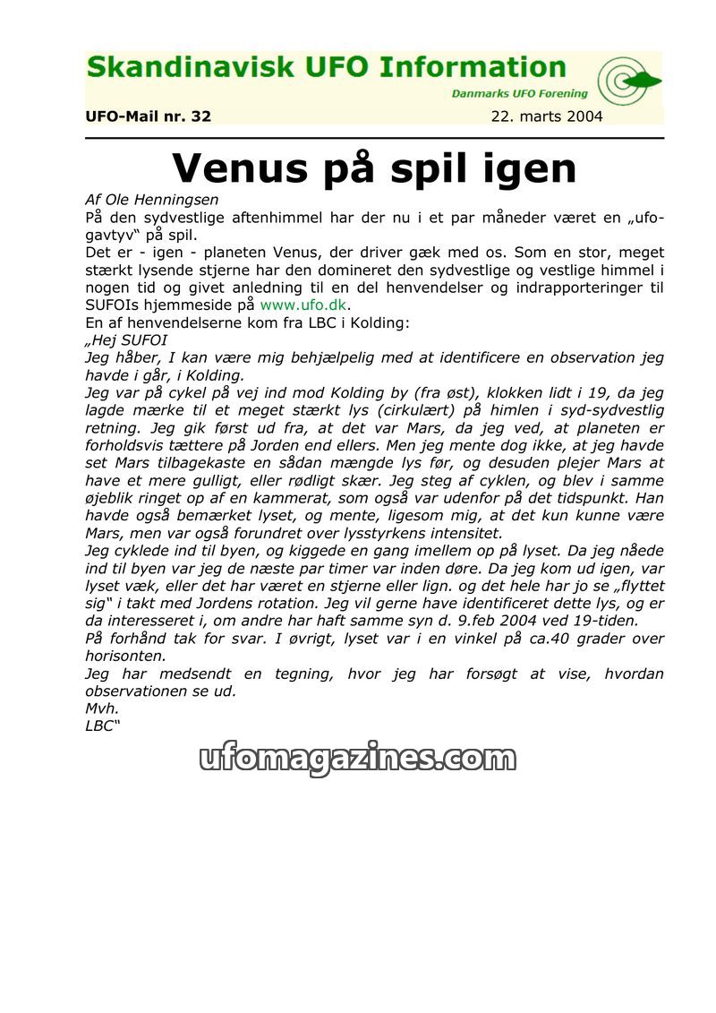 This issue of Skandinavisk UFO Information focuses on misidentifications of the planet Venus as UFOs. It details reports from Denmark, including an observation in Kolding on Februa