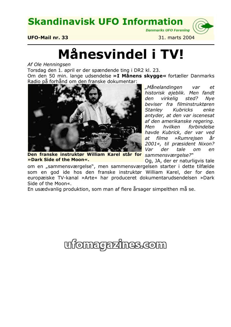 This issue of Skandinavisk UFO Information focuses on two celestial events. The first is a total lunar eclipse on the evening of Tuesday, May 4, 2004, which will be well-positioned