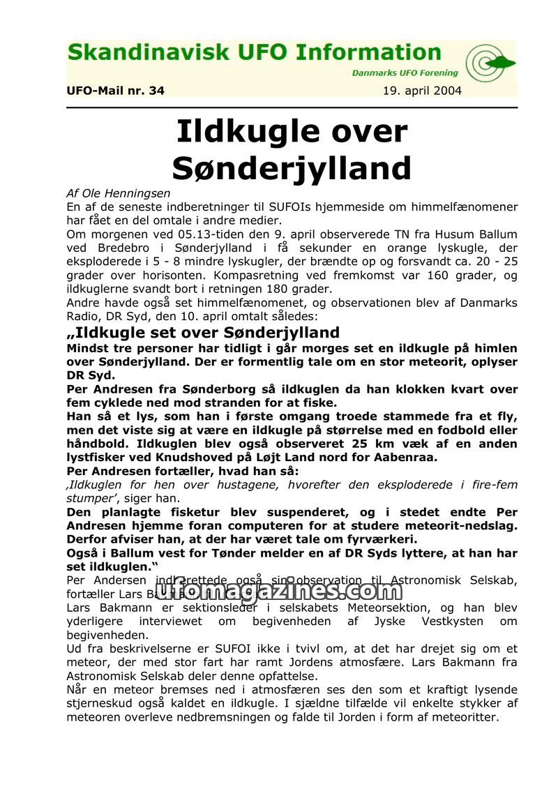 This issue of Skandinavisk UFO Information details several sightings of fireballs and other aerial phenomena. A significant event on April 9, 2004, involved a bright orange firebal