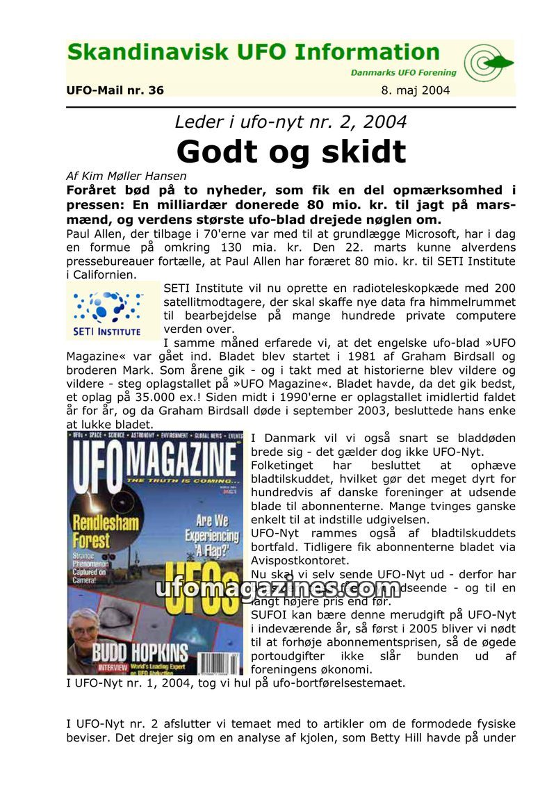 This issue of Skandinavisk UFO Information discusses two major news items: Paul Allen's donation to the SETI Institute for a radio telescope chain and the closure of the British UF