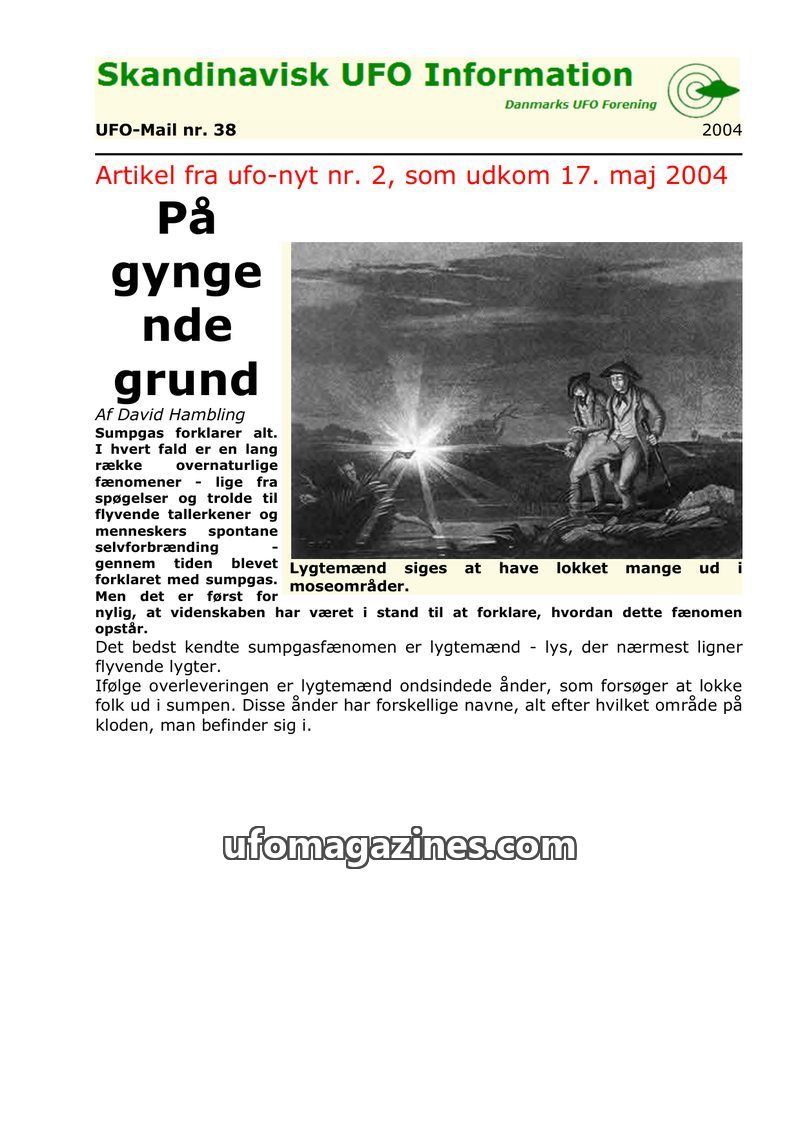 This issue of Skandinavisk UFO Information explores the 'swamp gas' phenomenon, traditionally used to explain sightings of will-o'-the-wisps and other mysterious lights. It details