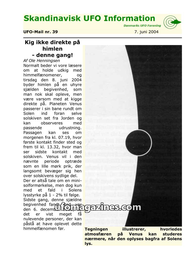 This issue of Skandinavisk UFO Information covers the rare Venus transit on June 8, 2004, detailing how to observe it safely and its historical significance, noting the last occurr
