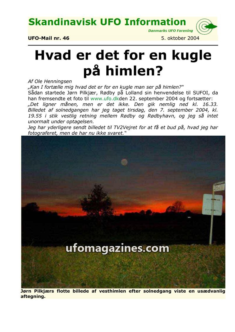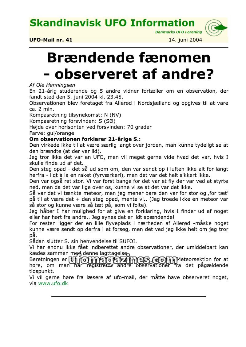 This issue of Skandinavisk UFO Information reports on a UFO sighting by a 21-year-old student and five other witnesses in Allerød, Denmark, on June 5, 2004. The object was describe