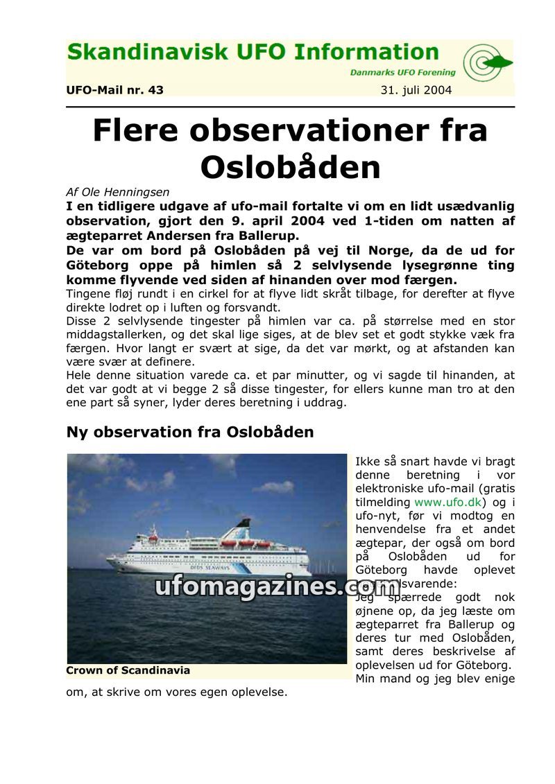 This issue of Skandinavisk UFO Information details several unusual aerial observations. The primary focus is on two separate incidents involving the 'Crown of Scandinavia' ferry ne