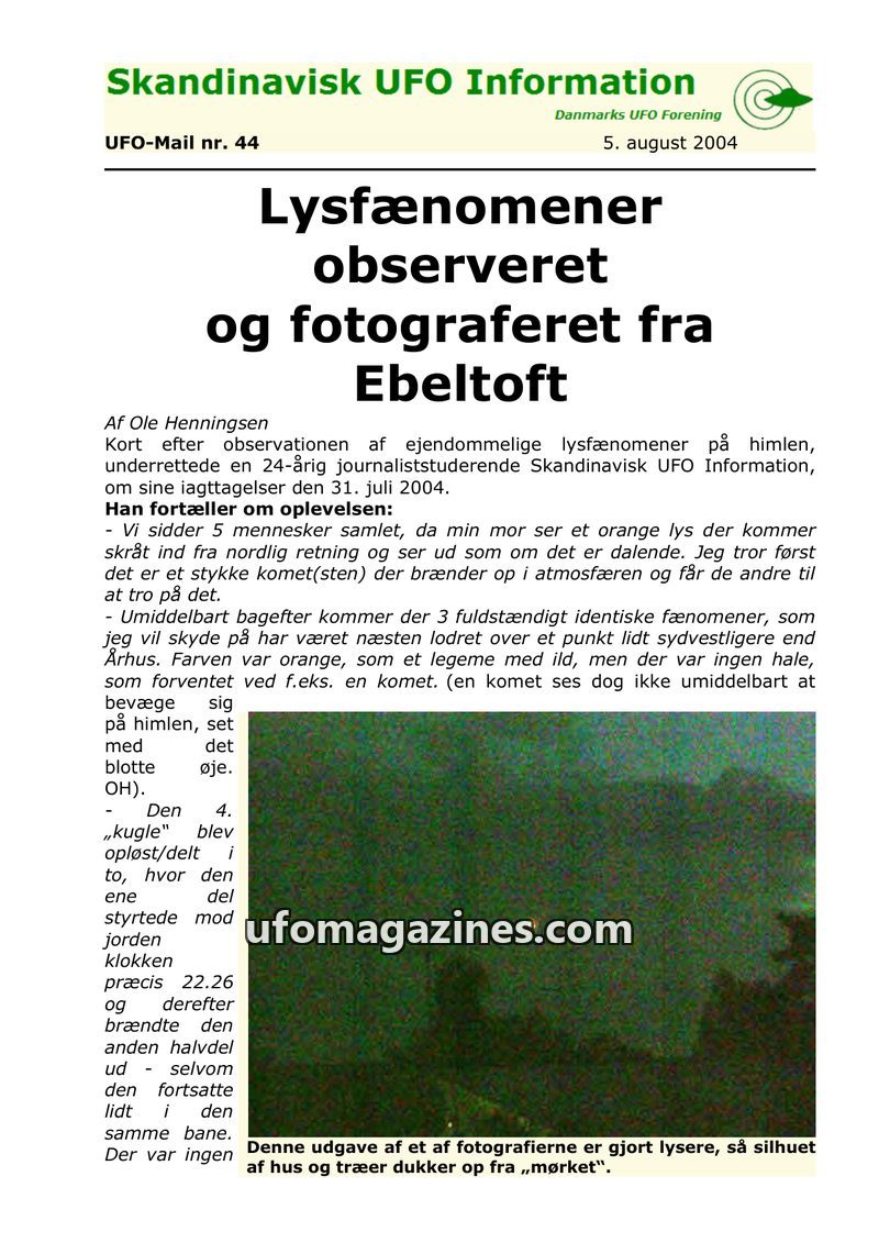 A 24-year-old journalism student reported and photographed unusual light phenomena over Ebeltoft on July 31, 2004. The objects were described as orange, spherical, and without tail