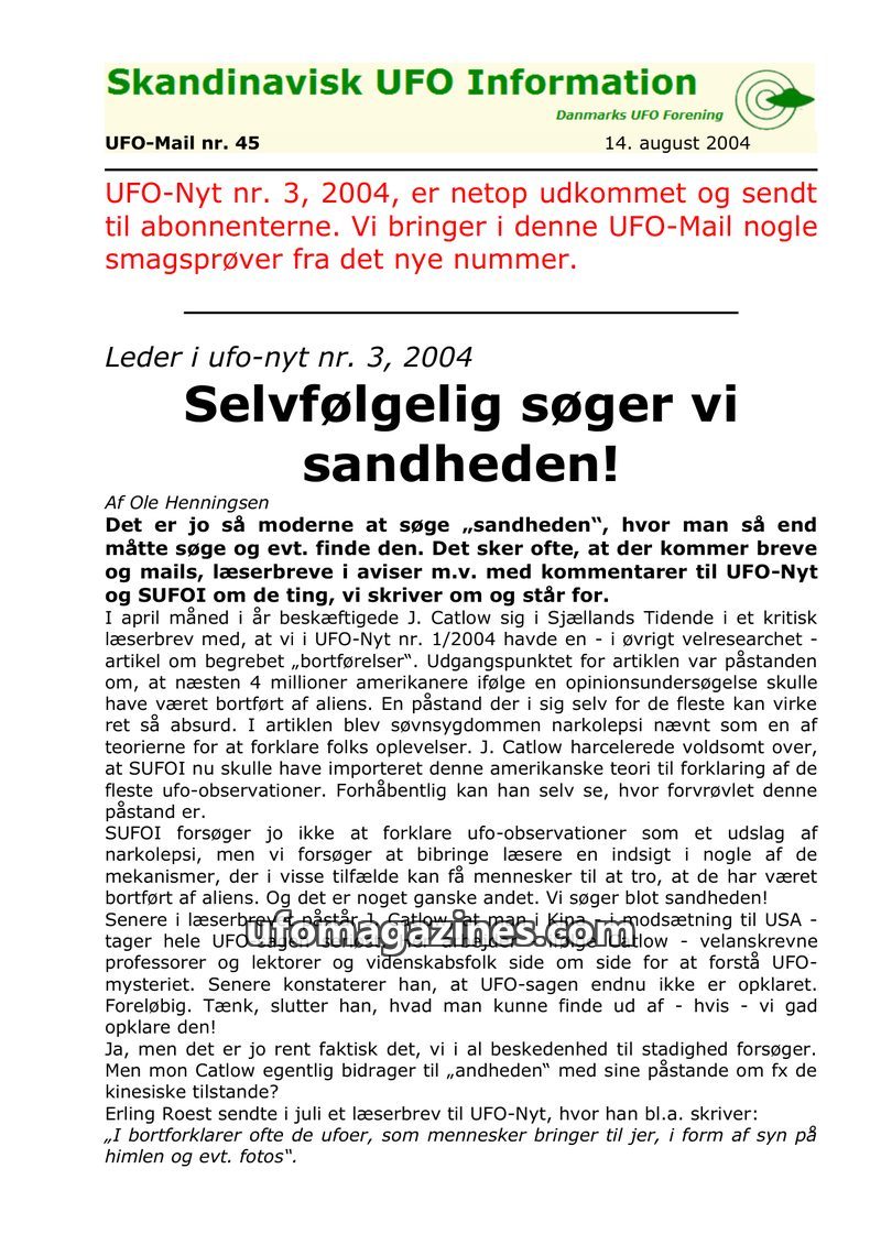 This issue of Skandinavisk UFO Information (UFO-Nyt #3, 2004) focuses on the ongoing search for truth regarding UFO phenomena. It includes an editorial emphasizing the importance o