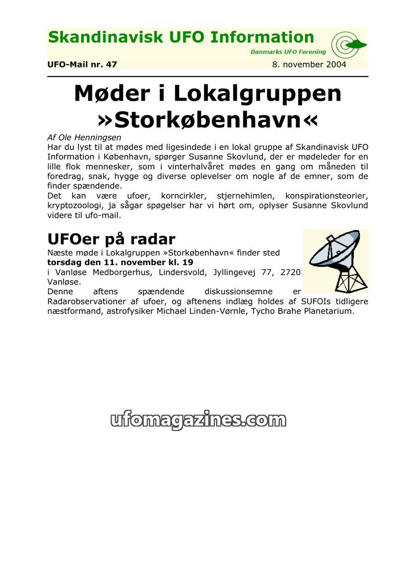 This issue of Skandinavisk UFO Information (Nov 2004) details upcoming meetings for the 'Storkøbenhavn' local group, focusing on radar UFO observations with a presentation by astro