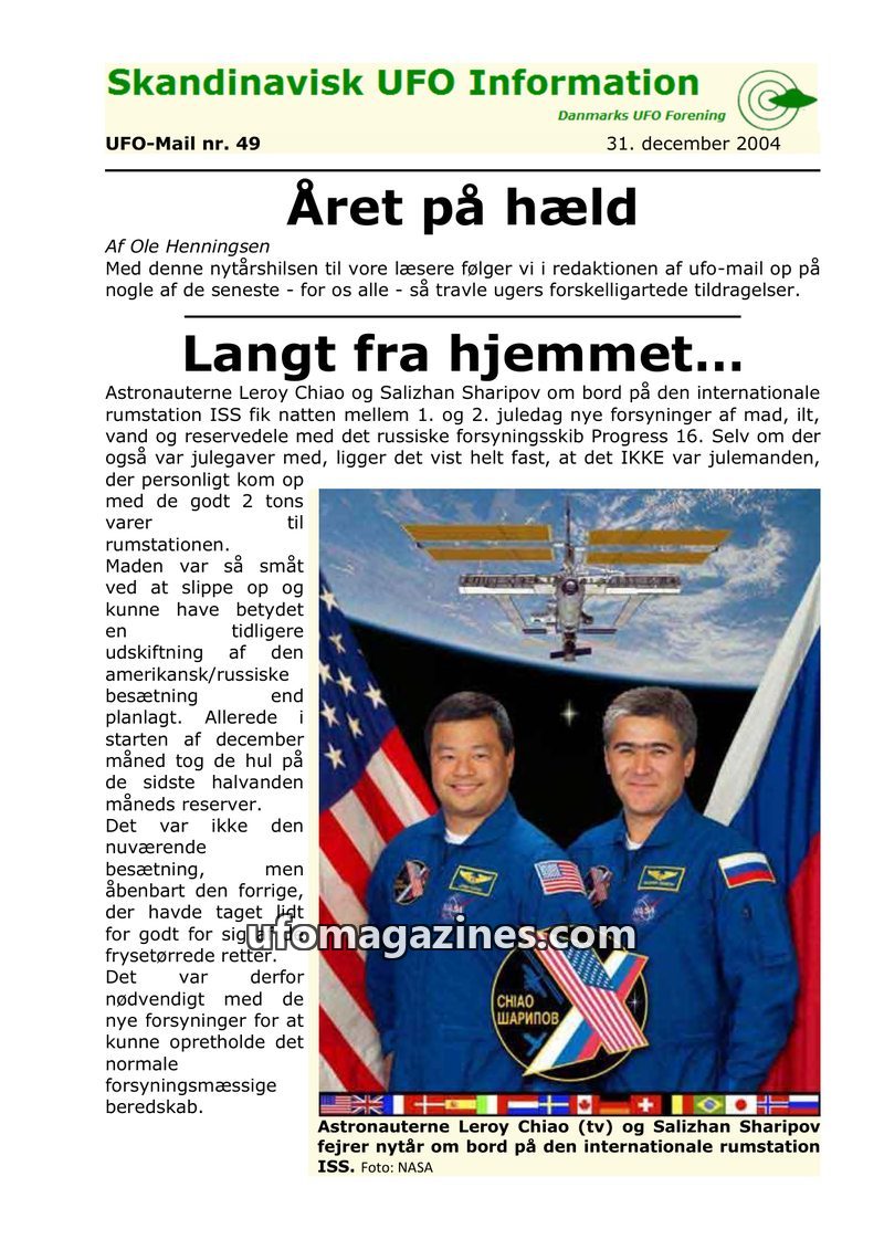 This issue of Skandinavisk UFO Information from December 2004 covers several topics. The ISS received vital supplies, averting a potential early crew rotation. Astronaut Leroy Chia
