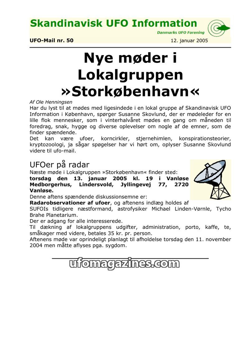 This issue of Skandinavisk UFO Information announces upcoming meetings for the 'Greater Copenhagen' local group, which discusses topics like UFOs, crop circles, and conspiracy theo