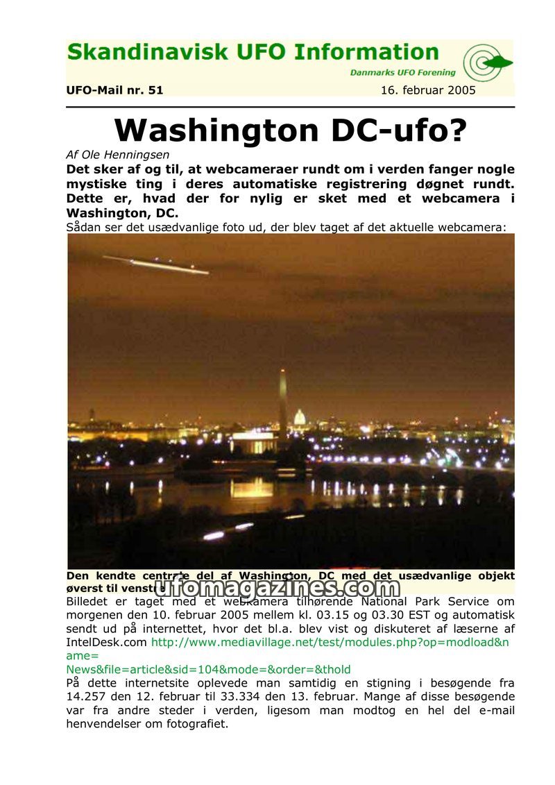 This issue of Skandinavisk UFO Information discusses a mysterious object photographed by a National Park Service webcam in Washington DC on February 10, 2005. The object, appearing
