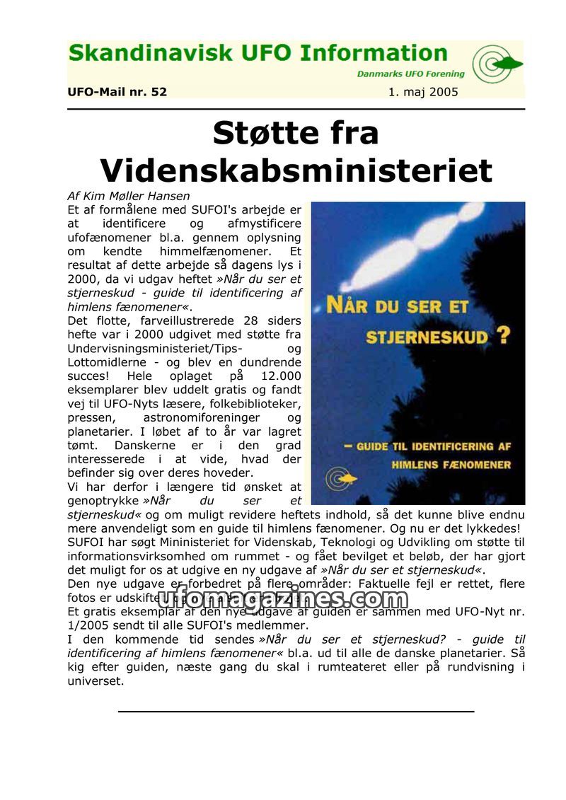 This issue of Skandinavisk UFO Information highlights the support received from the Danish Ministry of Science for SUFOI's updated guide to identifying celestial phenomena, 'Når du