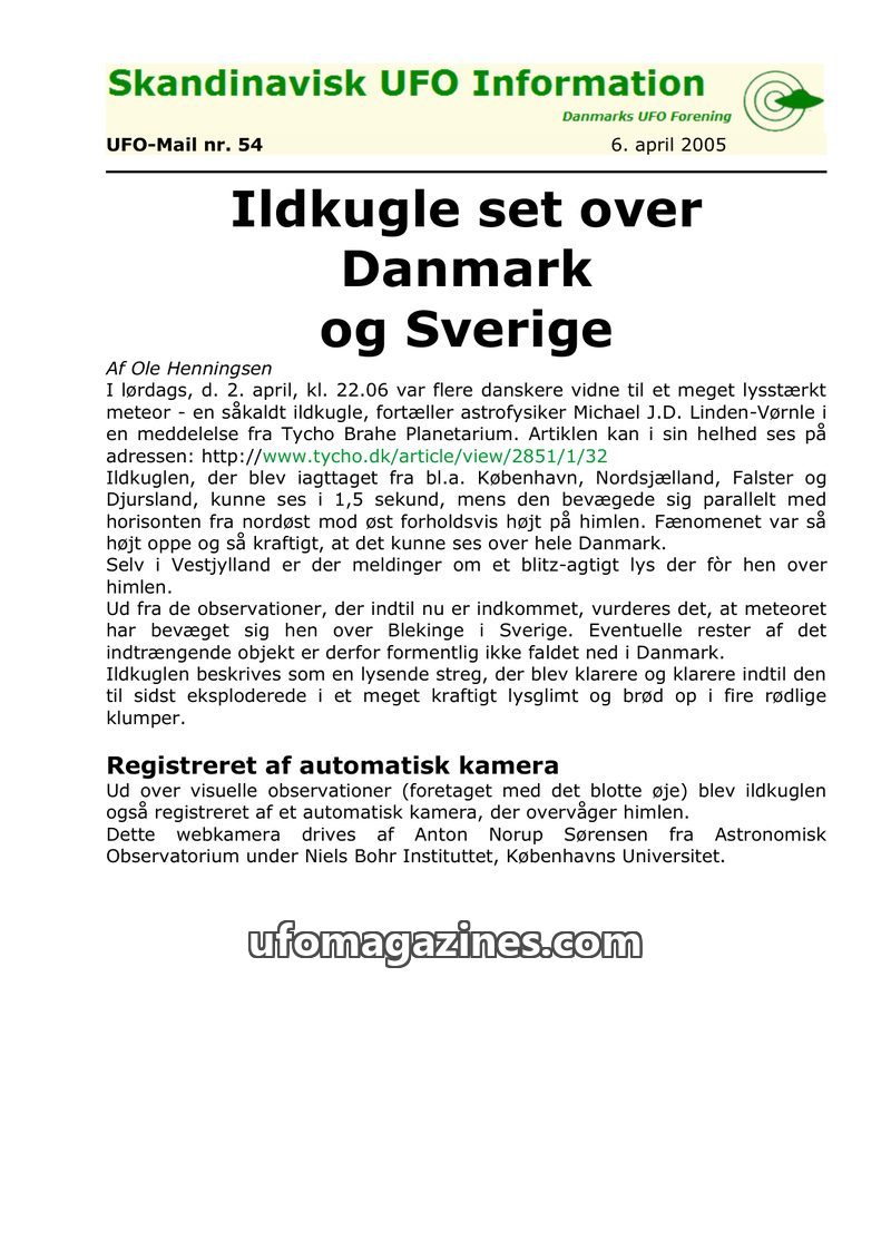 On April 2, 2005, a bright fireball was witnessed over Denmark and Sweden, observed from various locations including Copenhagen and Falster. The phenomenon moved parallel to the ho