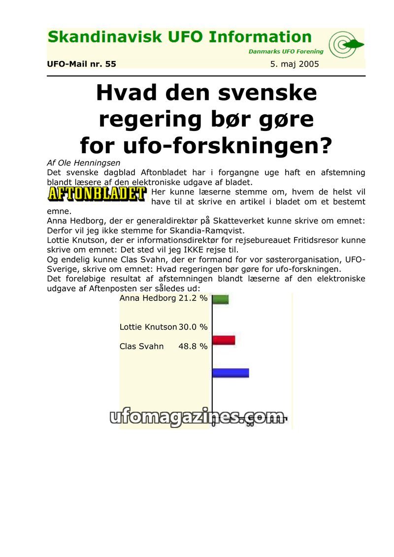 This issue of Skandinavisk UFO Information covers a reader poll in Aftonbladet about what the Swedish government should do for UFO research, with Clas Svahn receiving the most vote