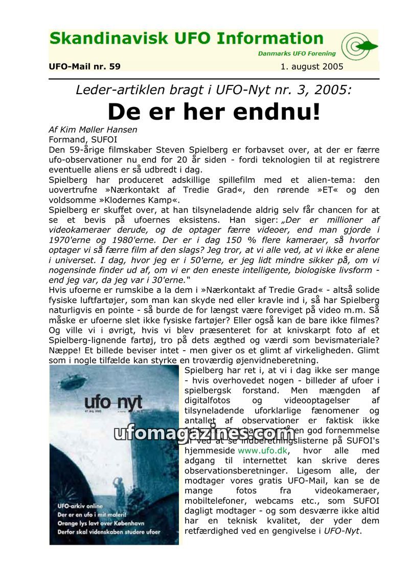 This issue of Skandinavisk UFO Information features an editorial by Kim Møller Hansen discussing Steven Spielberg's surprise at the decrease in UFO sightings despite advanced techn