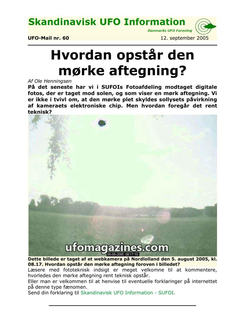 This issue of Skandinavisk UFO Information delves into two distinct phenomena: the appearance of dark markings in photographs, likely caused by camera chip artifacts when photograp