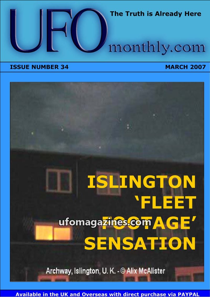 This issue of UFO monthly.com features the 'Islington Fleet Footage Sensation' and an in-depth interview with former MOD official Nick Pope, discussing UFO disclosure, military cap