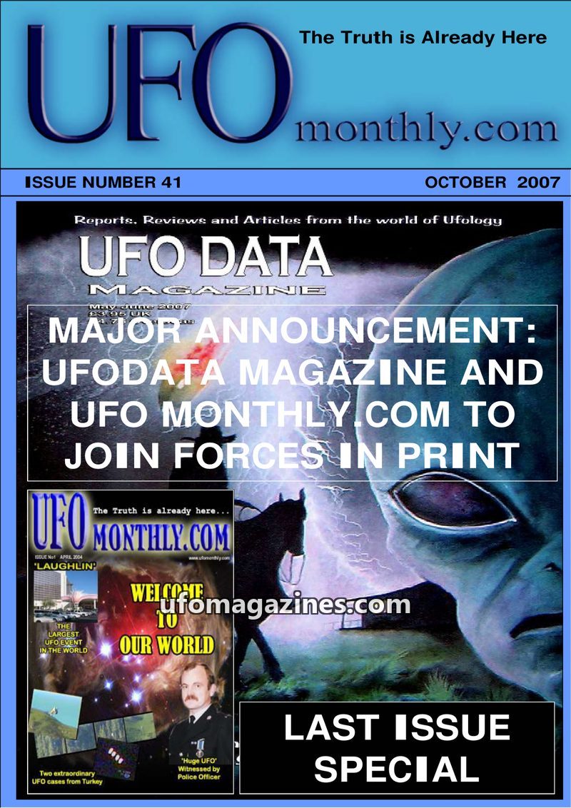 This is the final issue, number 41, of UFO Monthly.com, dated October 2007. The magazine is merging with UFODATA Magazine, a printed A4 glossy publication, with Gary Heseltine taki