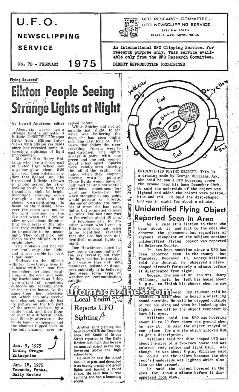 This issue of the UFO Newsclipping Service from February 1975 compiles various UFO sightings and reports from across the United States. Articles detail strange lights seen in Elkto