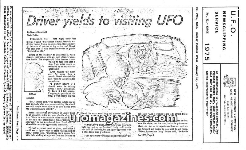 This issue of the UFO Newsclipping Service from March 1975 features numerous reports of UFO sightings across the US, including a driver's encounter in Wisconsin and police sighting