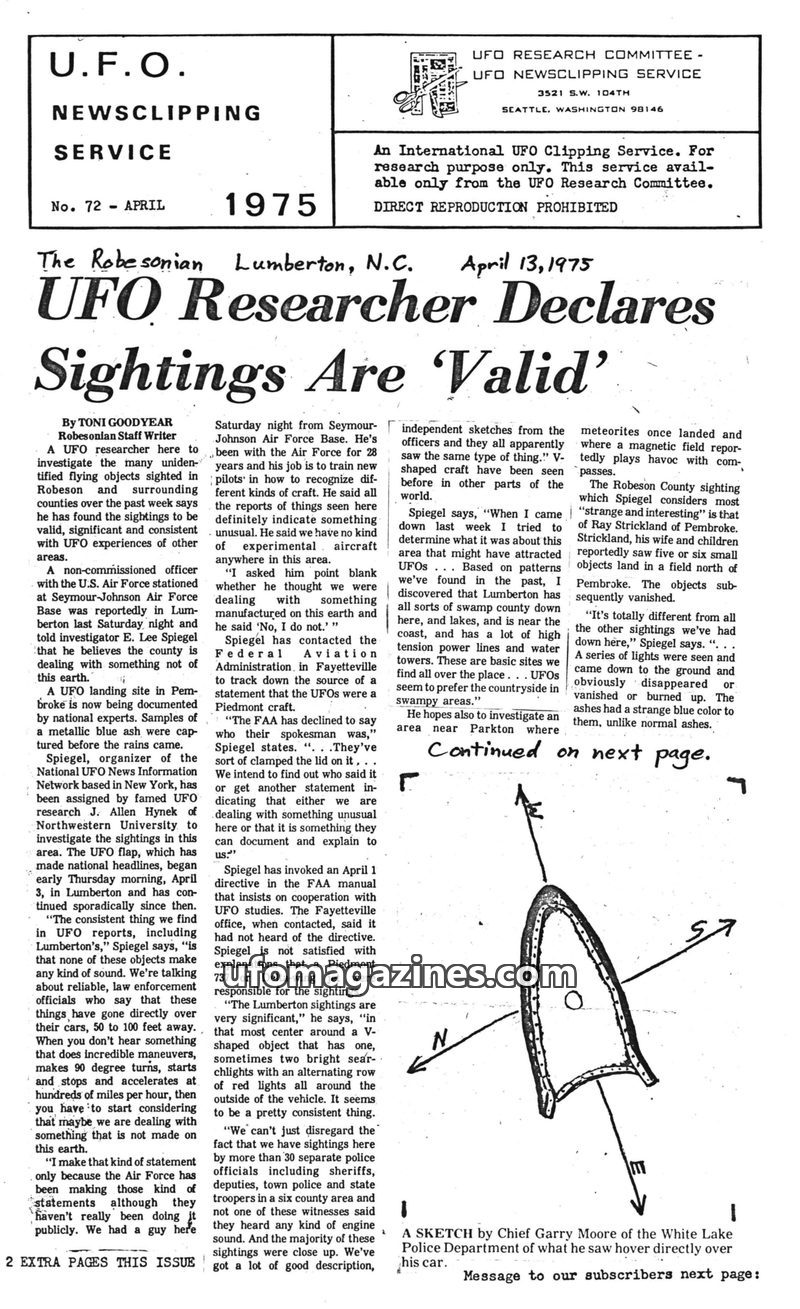 A UFO researcher, E. Lee Spiegel, has declared numerous sightings in Robeson County, North Carolina, to be valid and significant. These reports, often from law enforcement official