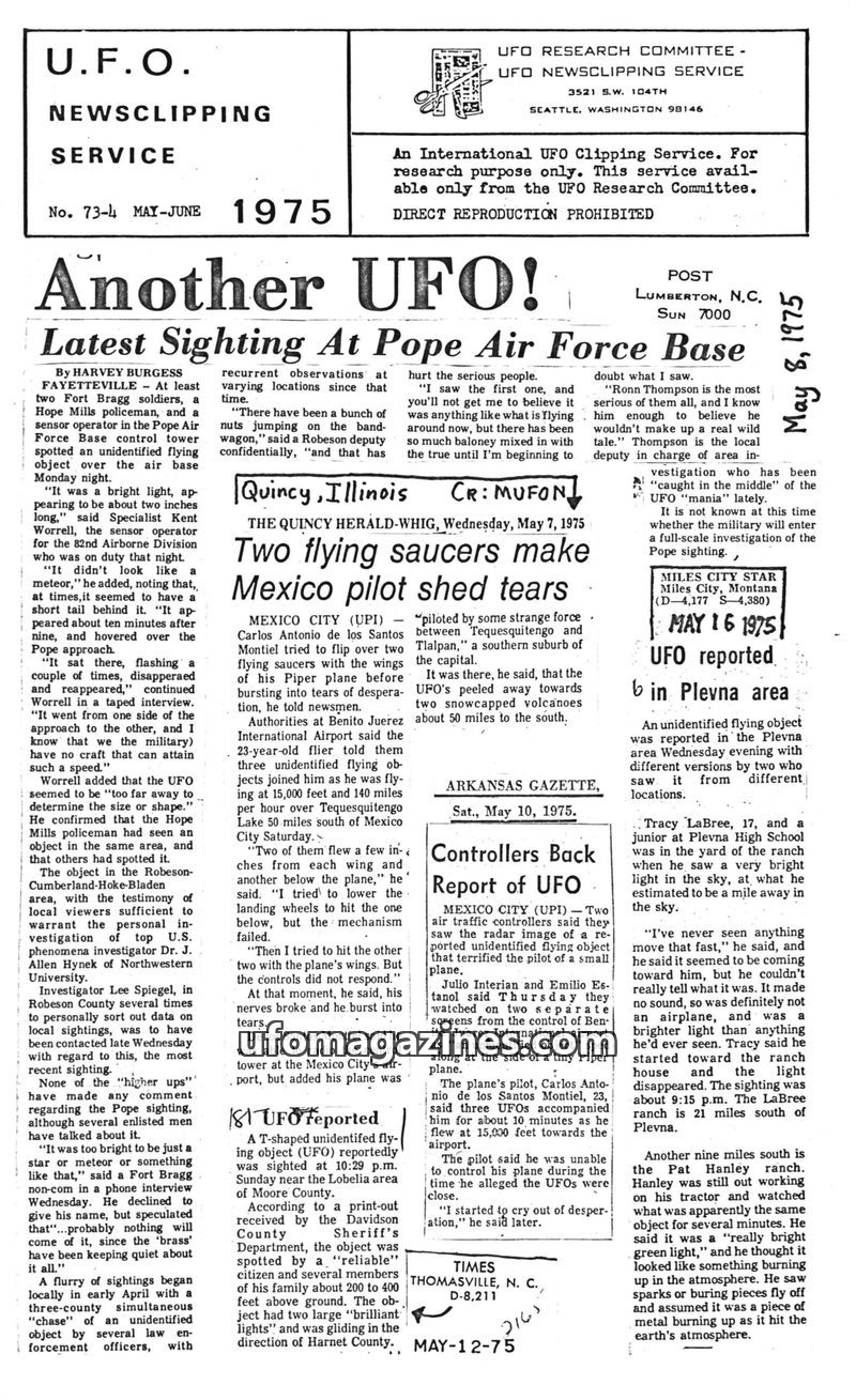 This issue of U.F.O. Newsclipping Service from May-June 1975 details numerous UFO sightings across the United States and Mexico. A prominent report describes a sighting at Pope Air